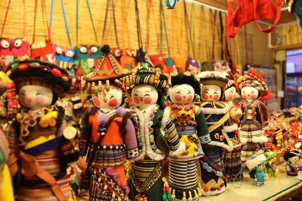 Dolls dressed in ethnic costumes are popular souvenirs for tourists in Lijiang.[Photo/CRIENGLISH.com] |