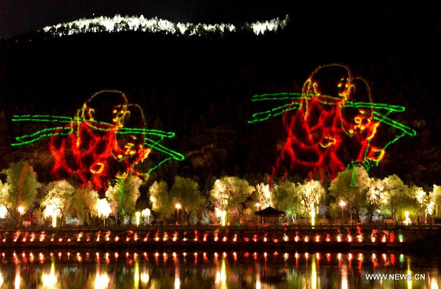 Photo taken on April 8, 2013 shows a 3D scenery by lasers in scenic area of Longmen Grottoes in Luoyang, central China's Henan province. The night tour at Longmen Grottoes, a world cultural heritage site, has been opened to public since Monday.[Photo/Xinhua] |