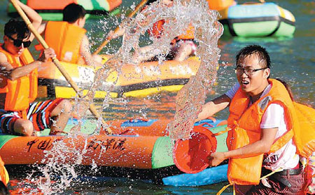 Visitors enjoy the fun of splash on Taoyuan River. Zhu Xingxin / China Daily |