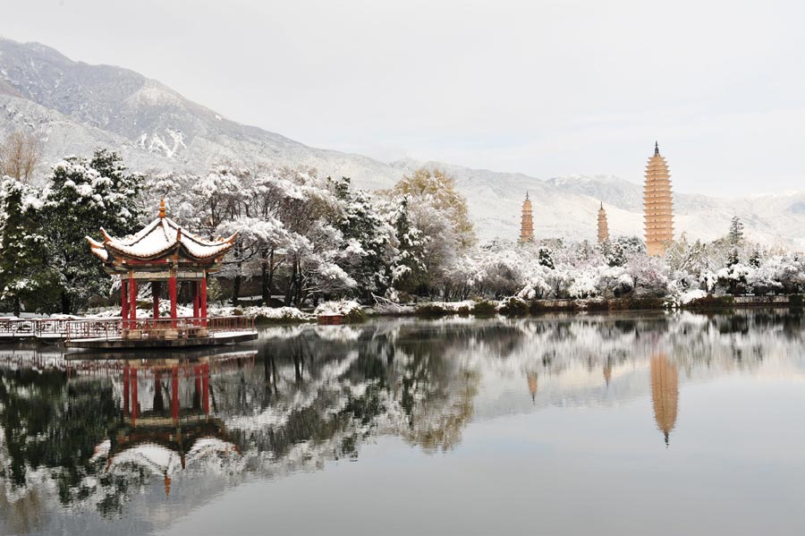 Photo taken on December 16, 2013 shows the snow scenery of the ancient town of Dali city, Southwest China's Yunnan province. A rare snowfall hit Dali during December 14 to December 16. [Photo/Xinhua]