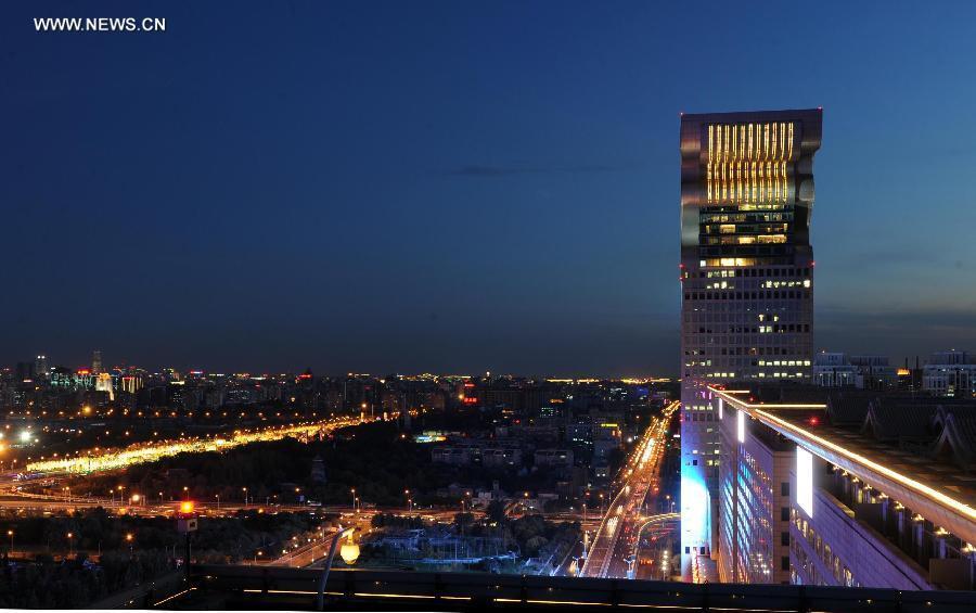 Photo taken on Nov 6, 2014 shows the night view around the Pangu Plaza in Beijing, China. The 2014 APEC Economic Leaders' Week is held in Beijing from Nov 5 to 11. [Photo/Xinhua]