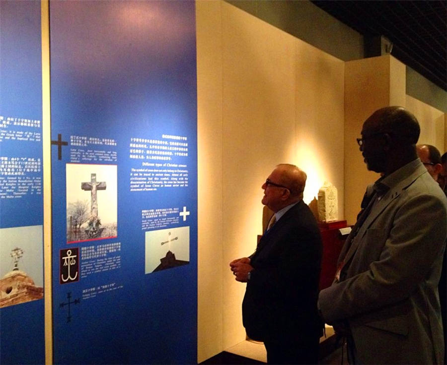 GhanimTaha Ahmed AL.Shibli, ambassador of the League of Arab States and Abdoulaye Fall, ambassdor of Senegal, read the introductions of Quanzhou's religious history. [Photo by Hu Zhe/chinadaily.com.cn]