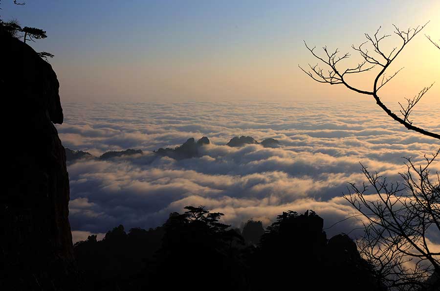 Thick clouds blanket Mount Huangshan, Anhui province, in this photo taken on Dec28, 2015. The sea of clouds is one of the major attractions in the Mount Huangshan scenic area.[Photo by Shi Guangde/Asianewsphoto]