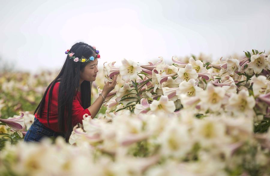 A tourist views lily flowers at a planting base in Jiujiang, East China's Jiangxi province, May 28, 2016. [Photo/Xinhua]