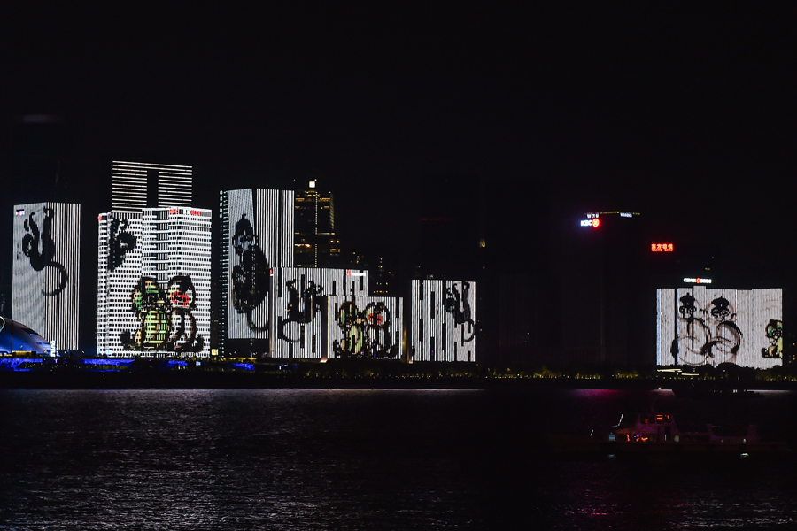 A grand light show, under the theme "City, Water, Light and Shadow", lit up the Qiantang River in Hangzhou on August 29. As one of the key lighting projects of G20 Summit, a total of 700,000 LED lights have been used in more than 30 high-rise buildings along the side of Qiantang River. Photos display the monkey-themed light show at Qiantang River. [Photo/Xinhua]