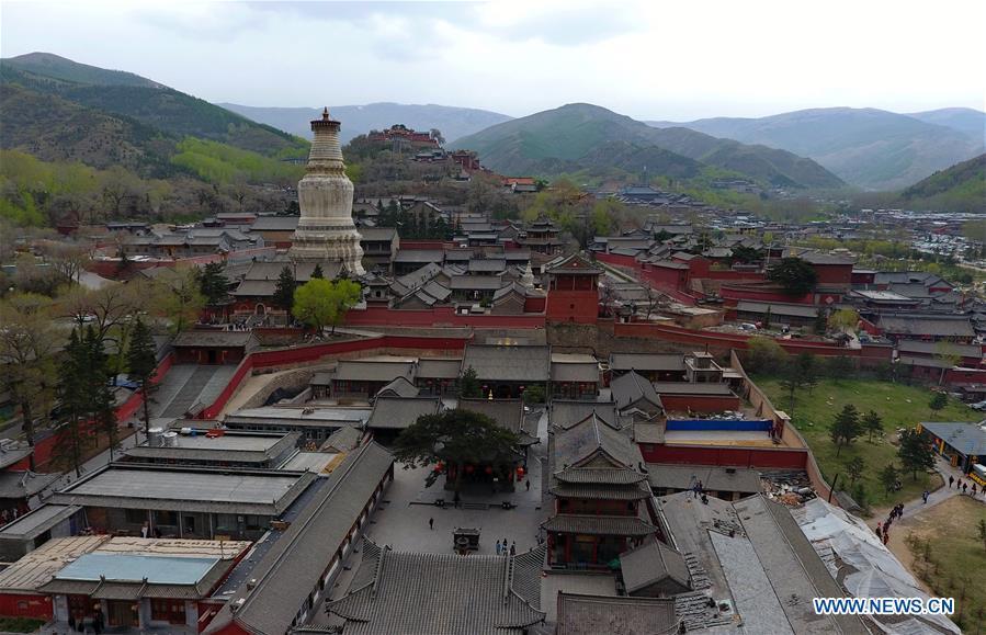 Photo taken on May 9, 2017 shows an aerial view of temples on Mount Wutai, one of four sacred Buddhist mountains in China, in North China's Shanxi province. Added to UNESCO's World Heritage List in 2009, Mount Wutai is home to over 50 Buddhist temples. [Photo/Xinhua]