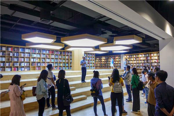 A media group visits a mall, which provides a large reading space, in Baigou.[Photo provided to chinadaily.com.cn] |