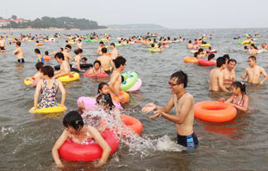 People swarm to beach to spend hot summer
