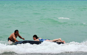 Tourists enjoy cool summer in Xinjiang's Ulunggur Lake