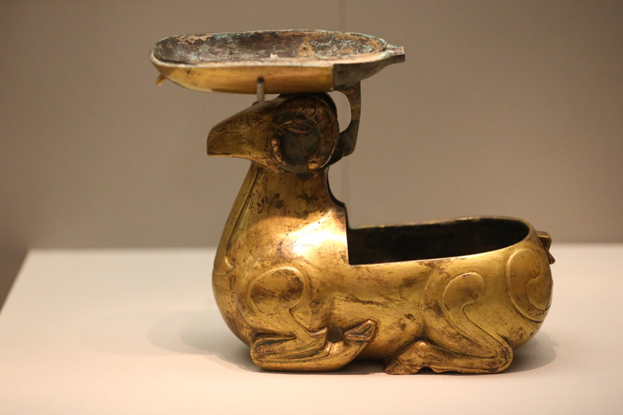 Gilt bronze ram-shaped lamp; palm-sized remainder of a Han Dynasty map. [Photo provided to China Daily]