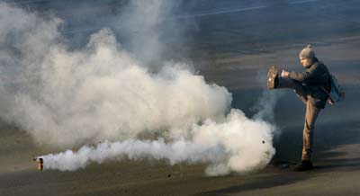smoke shell used by riot police during a demonstration in Minsk, March 25, 2006.