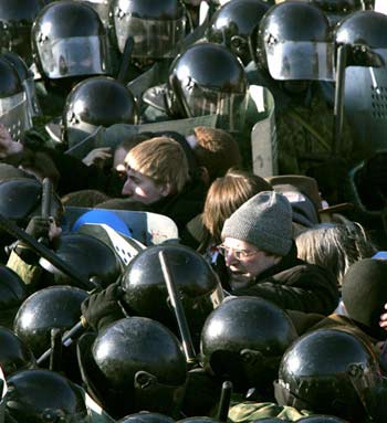 riot police during a demonstration in Minsk, March 25, 2006. Belarus's