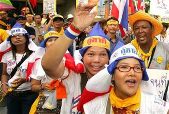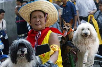 canine companions while joining a protest to oust Thai Prime Minister Thaksin