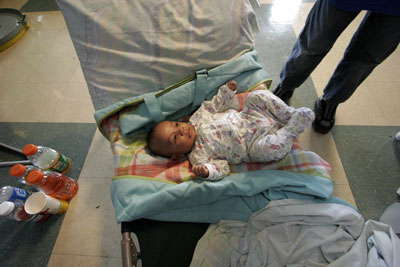 A three-month-old baby, rests on a cot in a disaster relief center set