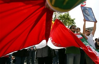 Iranian flags and a poster of Hezbollah leader, Sheik Hassan Nasrallah,
