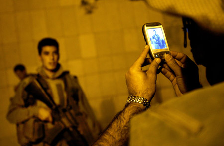 An Israeli soldier takes a photograph of his comrade in the northern town of