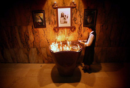 A Lebanese Christian woman lights candles during a religious ceremony at Al-Adra church in the city of Zahle, north of Beirut, August 13, 2006.[Reuters]