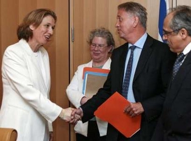 Minister Tzipi Livni (L) shakes hands with United Nations envoy Terje