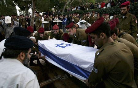 Israeli soldiers lower the flag-draped coffin of their comrade