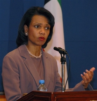 Secretary of State Dr. Condoleezza Rice answers questions from journalists