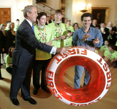 U.S. President George W. Bush (L) throws an inflatable ring after it was given to him by a remote-controlled robot nicknamed "MOE-ZIILLA" among member of team 365, the "Miracle Workerz" of MOE Robotics Group, during an event on the State Floor of the White House in Washington, April 30, 2007. [Reuters]