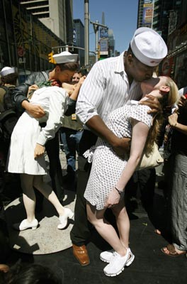 Gregorio Smith (L) of New York and Verity Greese (R) of England participate in a "Kiss-In" in front of the sculpture "Unconditional Surrender," in New York's Times Square August 14, 2007. Times Square hosted the event to commemorate the 62nd anniversary of Alfred Eisenstaedt's1945 LIFE photograph of a sailor kissing a nurse during V-J Day celebrations ending World War II. [Reuters]
