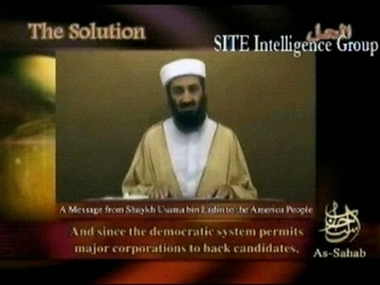 The 30-minute video was obtained by the SITE Institute, a Washington-based group that monitors terrorist messages. American officials said the US government had obtained a copy earlier and intelligence agencies were studying the video to determine whether it was authentic and looking for clues about bin Laden's health. In the video, a short excerpt of which was broadcast to the Arab world by Al-Jazeera television, bin Laden wears a white robe, a white circular cap and a beige cloak seated behind a table while reading an address to the American people from papers in front of him. His trimmed beard is shorter than in his last video, in 2004, and is fully black - apparently dyed, since in past videos it was mostly gray. He speaks softly, as he usually does, and has dark bags under his eyes, but his appearance dispelled rumors that he had died. The footage gives a rare look at the al-Qaida leader, who has likely avoided appearing in videos as a security measure. His emergence comes at a time when terrorism experts believe his terror network is regrouping in the lawless Pakistan-Afghanistan border region. Bin Laden makes no overt threats and does not directly call for attacks, according to the transcript, which was first posted by ABC News on its Web site. Instead, he addresses Americans, lecturing them on the failures of their leaders to stop the war in Iraq despite growing public opposition in the US "There are two solutions to stopping it. One is from our side, and it is to escalate the fighting and killing against you. This is our duty, and our brothers are carrying it out," bin Laden said. "The second solution is from your side. I invite you to embrace Islam," he said. One result of that, bin Laden said, would be an end to the Iraq war. He said "warmongering owners of the major corporations" would rush to appease voters who showed they are looking for an alternative, "and this alternative is Islam." He derided President Bush, saying events in Iraq have gotten "out of control" and the American leader "is like the one who plows and sows the sea: He harvests nothing but failure." Bin Laden frequently criticized capitalism, calling its leaders the real terrorists and threats to human freedom. "This is why I tell you: as you liberated yourselves before from the slavery of monks, kings and feudalism, you should liberate yourselves from the deception, shackles and attrition of the capitalist system," he said. Noting that and similar comments, a counterterrorism official in Washington said bin Laden appeared to be putting a new focus on attacking capitalism, multinational corporations and globalization. The official, who had read the transcript but not viewed the video, agreed to speak only on condition of anonymity. The video appeared to have been recently made. At one point, bin Laden mentions that "several days ago" Japan marked the 62nd anniversary of the Aug. 6, 1945, atomic bomb attack on Hiroshima. He also refers to the Democratic Party's congressional victory in last fall's election and to French President Nicolas Sarkozy, who was elected in May. He also shows a grasp of current events, dropping mentions of global warming and saying Americans are "reeling under the burdens" of a mortgage crisis. And he praises author Noam Chomsky, an early critic of the Iraq war, as well as Michael Scheuer, former head of the CIA's bin Laden unit, who has said poor US leadership was losing the war against terrorist groups. Bin Laden "knows Bush has low approval ratings, knows the significance of a growing awareness of global warming," said Thomas Sanderson, deputy director of the Transnational Threats Project at the Center for Strategic and International Studies. "He's trying to capitalize on what he sees as a shift back to the middle in American politics." Al-Qaida annually uses the anniversary of the Sept. 11 suicide attacks on the World Trade Center and the Pentagon as a propaganda opportunity, issuing videotapes to rally supporters and mock the United States. But the appearance of bin Laden this year makes a bigger splash. The al-Qaida leader had not appeared in new video footage since October 2004, and he had not put out an audiotape in more than a year, his longest period without a message. His deputy, Egyptian-born Ayman al-Zawahri, has issued numerous videos and audiotapes in the meantime as al-Qaida has increased the sophistication and speed of its media operations. Seth Jones, a terrorism expert at the RAND think tank, said that while the anniversary gives the pretext for the tape, it also comes at a time when the main al-Qaida leadership has managed to regroup. "There clearly has been a resurgence of core al-Qaida in the tribal areas of Pakistan" along the frontier with Afghanistan since 2005, Jones said. He said sympathy in that region for the Taliban has made it more receptive to militant Sunni groups, including al-Qaida. "It's really created a sanctuary," Jones said. Rita Katz, director of the SITE Institute, said she believes "strongly that al-Qaida has regrouped" but that its core bases are more scattered than previously, comprising several training camps in Pakistan and Afghanistan. She said it was likely bin Laden is hidden in a more secure location, away from any of those sites. During the video, bin Laden's image moves for only a total of about 3 1/2 minutes in two segments, staying frozen the rest of the time while his remarks continue. Katz said it appeared to be a technical problem rather than intentional, speculating the video might have been made with a cell phone. A former senior US intelligence official, who spoke on condition of anonymity, said it might have resulted from a technical glitch while al-Qaida passed the video through a variety of computer sites to mask its cyber trail. The United States intercepted the video before it was released on Islamic Web sites where al-Qaida usually posts its messages, a US counterterrorism official said in Washington. US officials had ana