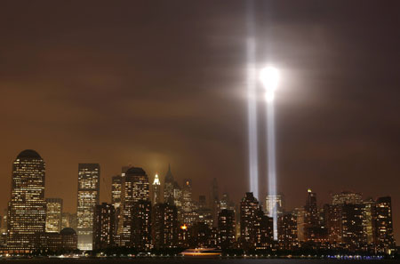 The "Tribute in Lights" shines on the skyline of lower Manhattan as the sixth anniversary of the attacks on the World Trade Center is observed in New York, September 11, 2007. [Reuters]