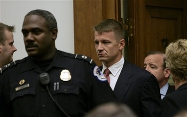 Erik Prince, founder of Blackwater USA, is escorted into the hearing room by a Capitol Hill police officer prior to giving his testimony before the House Oversight Committee hearing, October 2, 2007, which is examining the mission and performance of the private military contractor Blackwater in Iraq and Afghanistan. [Agencies]