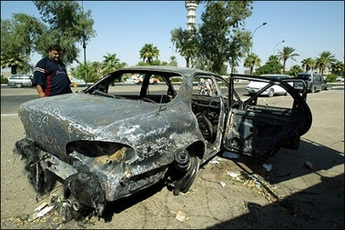 An Iraqi looks at a burnt car on the site where Blackwater guards opened fire in Baghdad in this September 2007 photo. Iraqi Prime Minister Nuri al-Maliki said that Blackwater should leave the country because of the mountain of evidence against the under-fire US security firm. [Agencies]