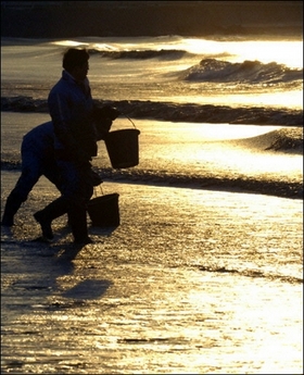 Residents struggle to remove crude oil in Taean, about 170km southwest of Seoul. South Korea's worst-ever oil spill reached the country's southwest coastline on Saturday, December 8, 2007, polluting beaches and threatening valuable sea farms, witnesses and officials said. [Agencies]