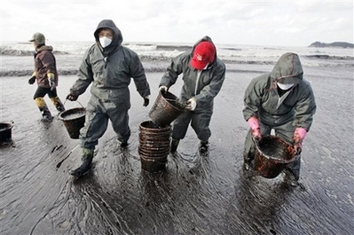 Local residents carry baskets full of retrieved crude oil that spreded over a beach following the Friday's oil tankeraccident in Mallipo beach, west of Seoul, South Korea, Saturday, Dec. 8, 2007. Some 2.7 million gallons of oil gushedFriday from a 146,000-ton Hong Kong-registered supertanker after a barge carrying a crane slammed into it about seven milesoff Mallipo beach. The spill was the country's largest, involving twice as much oil as a spill in 1995. [Agencies]