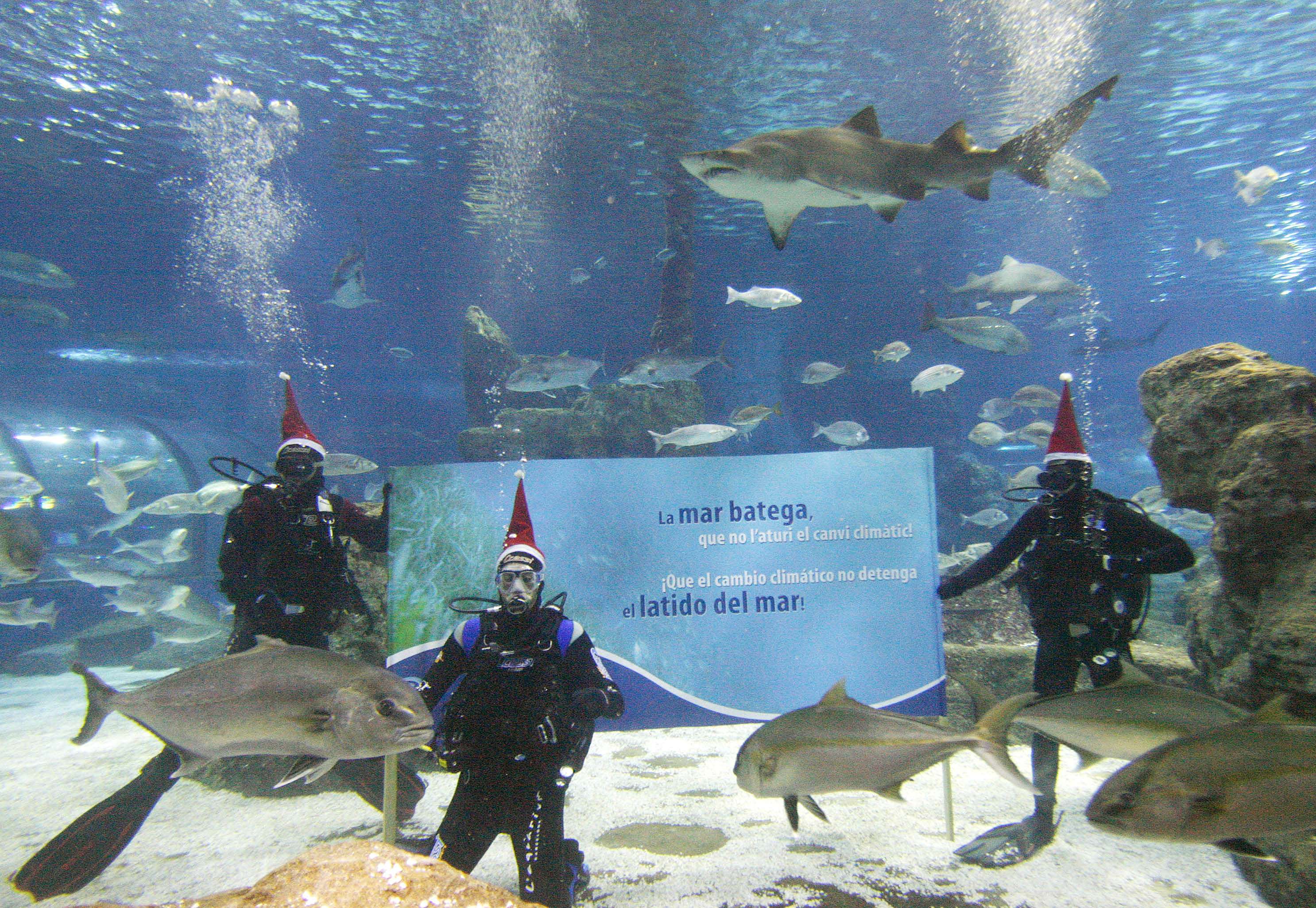| DKV Joventut's basketball player Rudy Fernandez (C) poses inside a tank at the Barcelona Aquarium while wearing a Santa Claus' hat in Barcelona, December 19, 2007. The placard in the background reads "Don't stop the heartbeat of the sea with climate change!". [Agencies] |