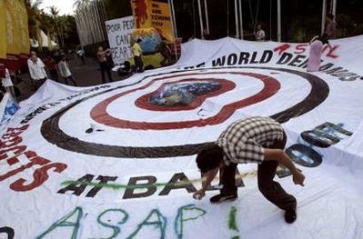 Activists spray paint on a giant banner near the venue of the UN Climate Change Conference in Nusa Dua, Bali island December 15, 2007. After all-night talks and an impassioned intervention by UN chief Ban Ki-moon, the Bali conference agreed to launch a process to negotiate a new treaty that will take effect when the UN Kyoto Protocol's commitments expire in 2012. [Agencies]