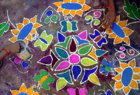 Updated: 2008-01-16 09:22 ![]() Women make a "rangoli" during the religious Hindu festival of "Makar Sankranti", which marks the start of spring, in Hyderabad January 15, 2008. Rangoli are traditional patterns made on the floor using coloured powders. [Agencies]