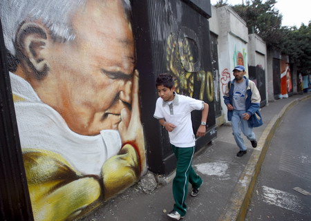 People walk past a graffito of the late Pope John Paul II on the perimeter wall of the Azteca stadium during a graffiti contest in Mexico City January 15, 2008. [Agencies]
