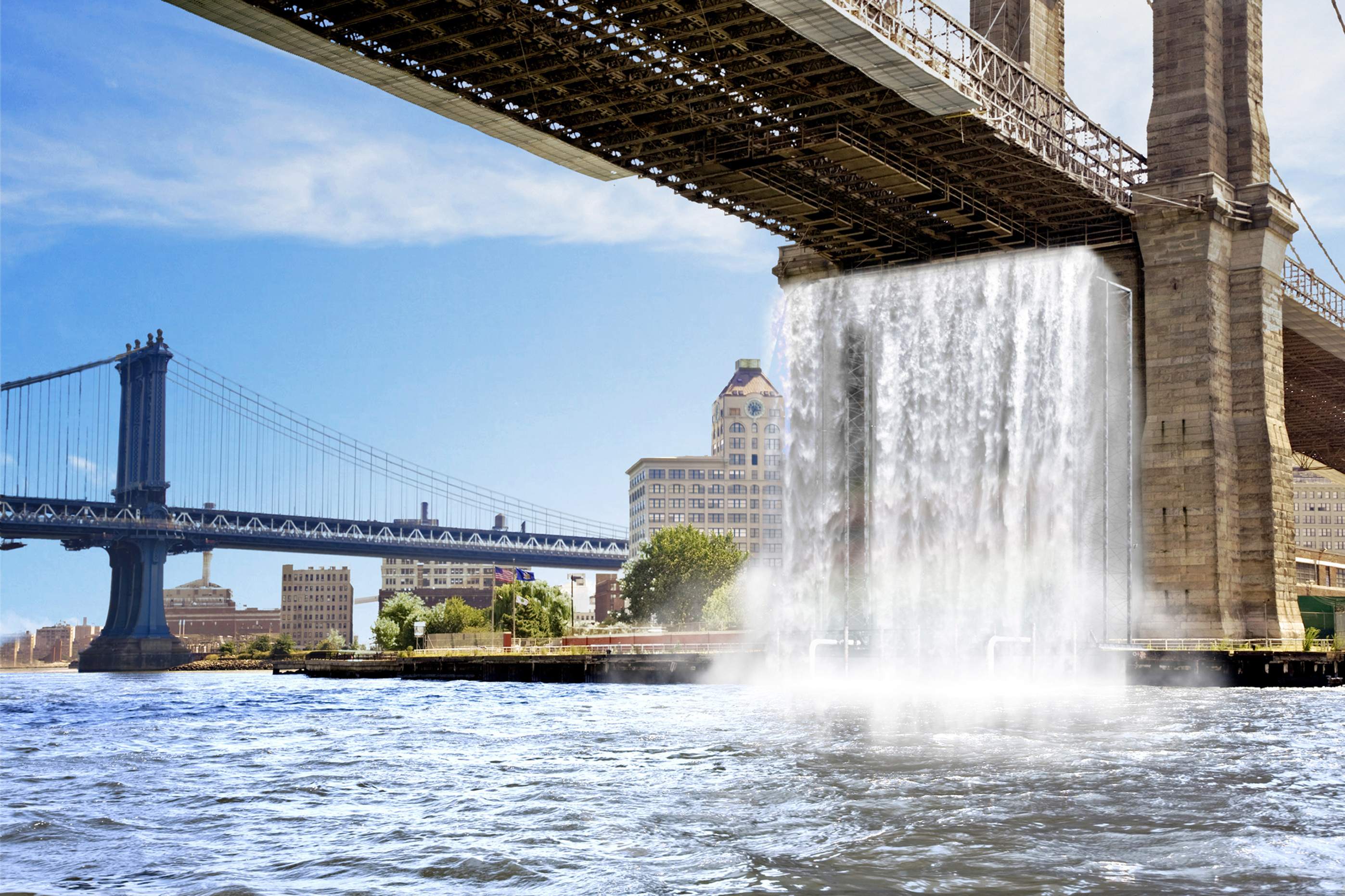 An artist's rendering of the New York City Waterfalls project, proposed by Danish artist Olafur Eliasson, is seen here in this undated handout photo. Four giant waterfalls will be erected in New York for three months this summer in a public art project city officials hope will create $55 million in extra tourism revenue for the Big Apple. The waterfalls, including one that will fall from the famed Brooklyn Bridge, are the brainchild of Eliasson. They will cost $15 million, to be funded by private donations to New York's Public Art Fund. [Agencies]