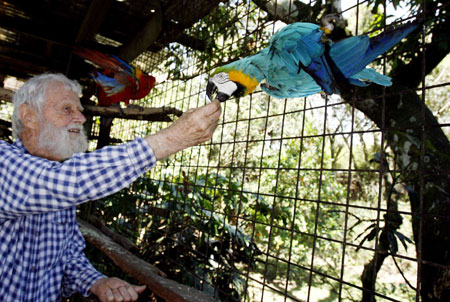 Richard Frisius, 88, a US citizen living in Costa Rica, feeds a Blue and Yellow Macaw at a nursery of macaws in Alajuela 15 miles from San Jose February 15, 2008. The Frisius have dedicated themselves to the conservation and protection of macaws with the goal of reproducing these species in captivity to then liberate them in the forests of Costa Rica. According to the last census by the Ministry of Environment and Energy, in the Costa Rican Pacific only 800 scarlet macaw and 50 green macaw remain in the wild. [Agencies]
