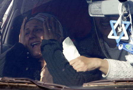 The wife of Ronnie Yehiye mourns upon her arrival to her husband's funeral in the southern Israeli village of Bitha February 28, 2008. Yehiye, a father of four, was killed when a rocket, fired by Palestinian militants in Gaza, struck a college where he was receiving vocational retraining on Wednesday. Israeli forces killed four Palestinian boys playing football in the Hamas-run Gaza Strip on Thursday, medical workers said, during intensified attacks in response to the death of an Israeli, Yehiye, in a rocket strike. [Agencies]