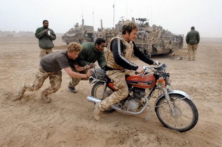 Britain's Prince Harry (L) pushes as a soldier tries to start an abandoned motorcycle in the desert in Helmand province, southern Afghanistan, February 21, 2008. Prince Harry is being withdrawn from Afghanistan immediately, the Defence Ministry said on February 29, 2008, after news leaked on the Internet that he had been secretly fighting on the front lines for 10 weeks. Photograph taken February 21, 2008. [Agencies]