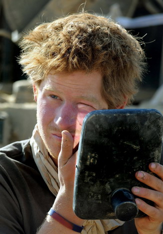 Britain's Prince Harry uses a mirror to remove dust from his eye while in the desert in Helmand province, southern Afghanistan, February 20, 2008. Prince Harry is being withdrawn from Afghanistan immediately, the Defence Ministry said on February 29, 2008, after news leaked on the Internet that he had been secretly fighting on the front lines for 10 weeks. Photograph taken February 20, 2008. [Agencies]