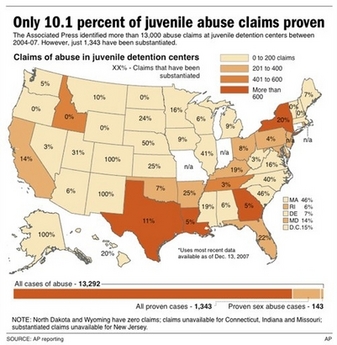 If some of those girls and their advocates are to be believed, it is also a cruel and frightening place. The school has been sued twice in the past four years. One suit brought by the U.S. Justice Department, which the state settled in 2005, claimed detainees were thrown naked in to cells and forced to eat their own vomit. The second one, brought by eight girls last year, said they were subjected to "horrendous physical and sexual abuse." Several of the detainees said they were shackled for 12 hours a day. These are harsh and disturbing charges — and, in the end, they were among the reasons why state officials announced in February that they will close Columbia. But they aren't uncommon. Across the country, in state after state, child advocates have deplored the conditions under which young offenders are housed — conditions that include sexual and physical abuse and even deaths in restraints. The U.S. Justice Department has filed lawsuits against facilities in 11 states for supervision that is either abusive or harmfully lax and shoddy. Still, a lack of oversight and nationally accepted standards of tracking abuse make it difficult to know exactly how many youngsters have been assaulted or neglected. The Associated Press contacted each state agency that oversees juvenile correction centers and asked for information on the number of deaths as well as the number of allegations and confirmed cases of physical, sexual and emotional abuse by staff members since Jan. 1, 2004. According to the survey, more than 13,000 claims of abuse were identified in juvenile correction centers around the country from 2004 through 2007 — a remarkable total, given that the total population of detainees was about 46,000 at the time the states were surveyed in 2007. Just 1,343 of those claims of abuse identified by the AP were confirmed by various authorities. Of 1,140 claims of sexual abuse, 143 were confirmed by investigators. Experts say only a fraction of the allegations are ever confirmed. These are some of the most troubled young people in the country and some will make up stories. But in other cases, the youth are pressured not to report abuse; often, no one believes them anyway. Undoubtedly, juvenile correction facilities and their programs benefit many of the youth who experience them by offering substance abuse programs, educational courses and mental health counseling. And for many troubled youth, the facilities are the last hope to straighten out problems that could eventually lead them to suicide, prison or other institutions. |