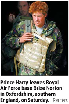 Updated: 2008-03-03 08:53 Prince Harry, home from his abandoned military mission to Afghanistan, says he hopes to return to combat zones as soon as possible. The soldier prince was met by his father, Prince Charles, and brother, Prince William, as he landed at an air force base in England on Saturday after serving as a soldier for 10 weeks in the volatile Helmand province. Harry's secret tour of duty - due to last until April - abruptly ended after a magazine and websites disclosed details of his whereabouts. The prince's mission had previously gone unreported as part of an agreement between the Ministry of Defense and major news organizations designed to protect the 23-year-old prince and his fellow soldiers. "'Angry' would be the wrong word to use but I am slightly disappointed. I thought I could see it through to the end and come back with our guys," Harry said after landing in Britain. He said he hoped to return to Afghanistan soon and has already asked his commanding officer to approve a new mission. "I would love to go back out, and I've already mentioned it to him that I want to go out very, very soon," Harry said. Air Chief Marshal Sir Jock Stirrup, the head of Britain's armed forces, said yesterday that any future deployment would depend on whether Harry poses a risk to his colleagues. "I would have to be clear that the risks to the operation, in the widest sense of the people deployed on that operation, would be no higher than they would normally be," Stirrup told Britain's Sky News television. Harry - a cornet, or second lieutenant - said he hoped for future agreements between the military and the media not to report on his deployments to help him pursue a full army career. But General Sir Richard Dannatt, head of Britain's army, said there is no immediate prospect of the prince returning to combat for 12 to 18 months. "Actually, the immediate prospect of Prince Harry going anywhere else is some way off in the future," he said, explaining that the prince has a usual rest period and then a number of training and regimental commitments. But Harry's elder brother, William - second in line to the British throne - is likely to serve overseas with the military, probably on board a Royal Navy warship, the defense ministry said. Officials said William could be deployed later this year on a tour to areas such as the South Atlantic, the Persian Gulf, the Pacific Ocean or the West Indies. "It's our intention to give Prince William as full a taste of life in the Royal Navy as possible," a Navy spokesman said on customary condition of anonymity in line with policy. William - the presumptive future king of Britain - has trained as a fighter pilot and is eager to serve overseas, Harry said. "I know he'd love to, whether it's on the ground or whether it's 15,000 feet up, bombs strapped to the wings," he said. |