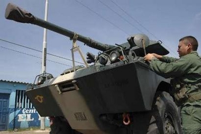 A Venezuelan soldier prepares an armored personnel carrier as it drives through the town of Paraguaipoa towards the border with Colombia, in the western state of Zulia, March 4, 2008. [Agencies]