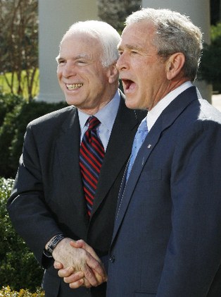 U.S. President George W. Bush (R) and presumptive Republican presidential nominee, Sen. John McCain (R-AZ), shake hands in the White House Rose Garden in Washington, March 5, 2008. Bush offered McCain his formal endorsement on Wednesday.[Agencies] |