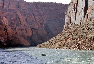 A boat navigates the turbulent waters caused by the jet tubes at the Glen Canyon Dam being released Wednesday, March 5, 2008 in Page, Ariz. The US Department of Interior is experimenting with high flows of water from the dam to help, in part, to rebuild beaches along the Colorado River that runs through the Grand Canyon.[Agencies]
