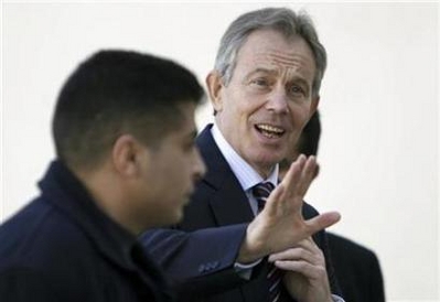 Former British Prime Minister and Middle East peace envoy Tony Blair (R) waves upon his arrival for a meeting with Palestinian President Mahmoud Abbas in the West Bank city of Ramallah in this February 7, 2008 file photo. Blair will teach at Yale University in the next academic year starting in September, leading a course on "faith and globalization," the Ivy League school said on March 7, 2008. [Agencies]