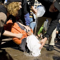 Protesters simulate waterboarding torture during a rally in front of the US Justice Department in 2007. US President George W. Bush plans to veto legislation passed by the Senate to bar the CIA from using harsh interrogation methods including waterboarding, his spokeswoman said Thursday. [Agencies]