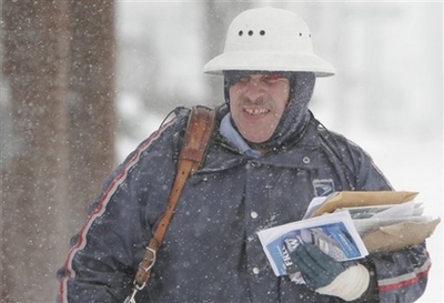 Letter carrier John Vazquez braves the snowy weather as he delivers mail on his route Saturday, March 8, 2008 in Columbus, Ohio. A foot of snow buried parts of the Ohio and Tennessee valleys early Saturday, shutting down travel and many public events. Blizzard warnings remained in effect in Ohio, with winter storm warnings from Tennessee to upstate New York and northern Maine. Wind up to 35 mph whipped the snow and cut visibility to less than a quarter mile in places, the weather service said. [Agencies]