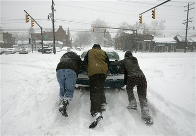 A motorist gets a help after his car got stuck in the deep snow Saturday, March 8, 2008 in Columbus, Ohio. A foot of snow buried parts of the Ohio and Tennessee valleys early Saturday, shutting down travel and many public events. Blizzard warnings remained in effect in Ohio, with winter storm warnings from Tennessee to upstate New York and northern Maine. [Agencies]